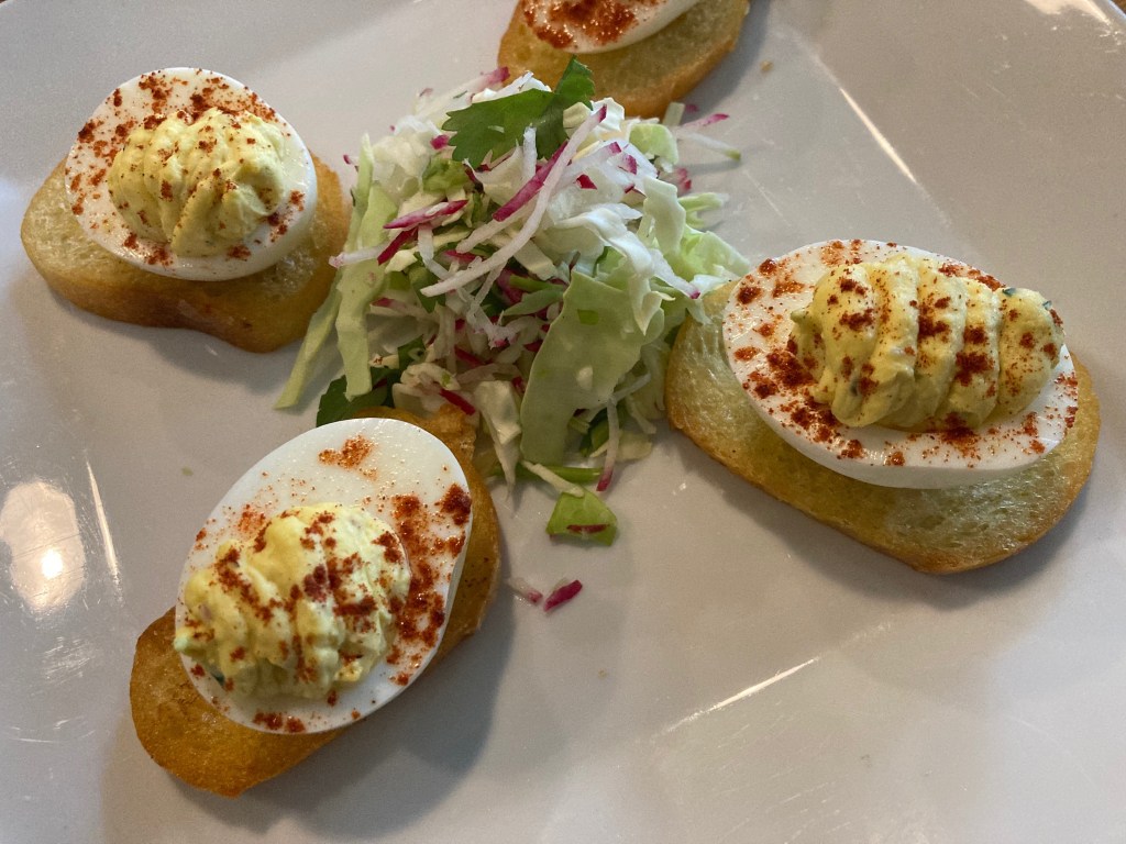 In the Bellingham area and looking for a local and delicious place to eat? Then you should definitely give Boundary Bay Brewery a try. Opening in 1995 as the first and third brewery to the city (first in permits, third brewery to open its doors to the public), it offers a sufficient taplist, cocktails, wine, cider, and non-alcoholic drinks, in addition to a well crafted food and dessert menu. We ordered a flight (served on a tiny boat!) to begin our meal, followed by an appetizer of deviled eggs. The flight itself consisted of all their malty beers and one fruity. By far our favorite was the Imperial Oatmeal Stout—a medley of dark malts and oats.