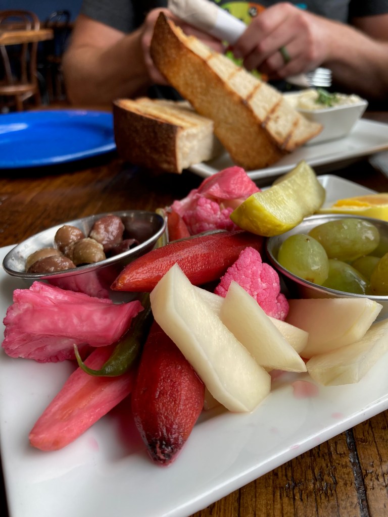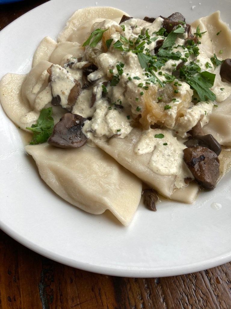 For food we had the Pickle Plate as an appetizer and also a side of toast. The Pickle Plate was interesting (in a good way) as I’ve never had pickled grapes before. The eggs were also dyed (from pickling) a lovely bright yellow. The plate was salty and vinegary enough to satisfy any pickle fan. For the entree we chose Traditional Pierogis (potato and cheese) which was prepared in a creme sauce that included beer mushrooms and caramelized onions. So good!