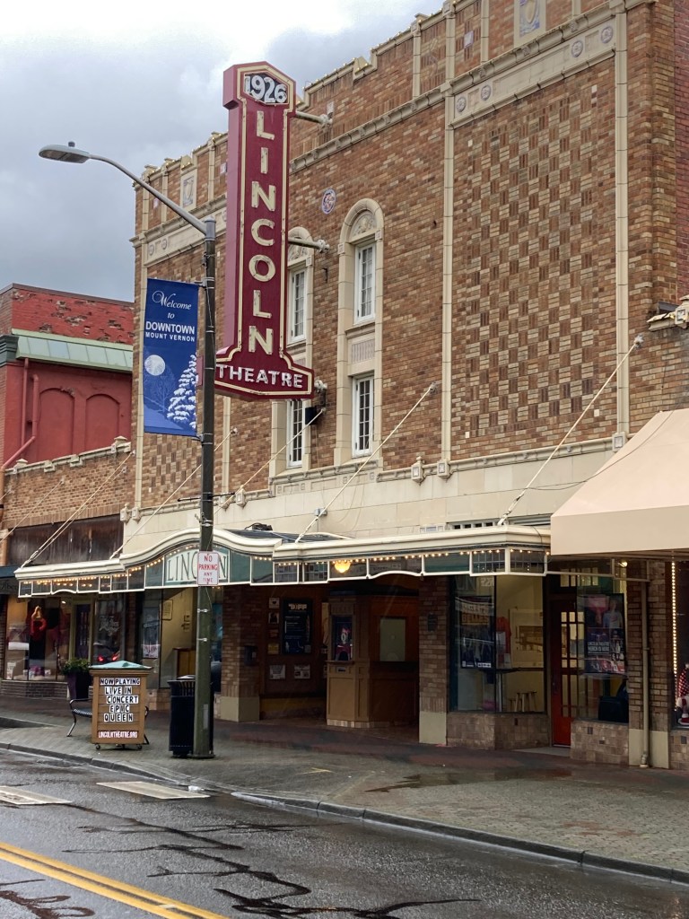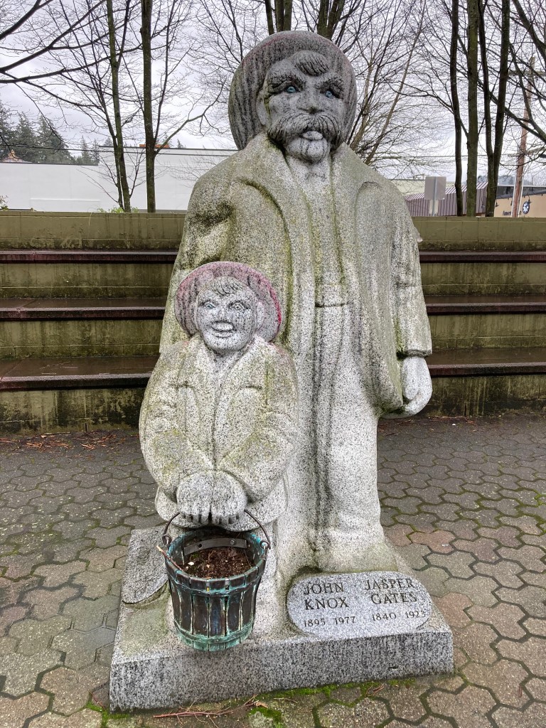 What can be said about Mt. Vernon other than it’s a cute, artistic little city that is centrally located next to the Skagit River, and holds a population of around 35,200. Typically known for the annual Skagit Valley Tulip Festival with millions of tulips grown every Spring. However, we were there to explore the town a little bit and participate in the Illuminight Winter Walk. We began our tourism by checking out a carved stone statue of the city’s founder Jasper Gates, with his grandson John Knox standing next to him. The statue is a commissioned piece created by the artist Tracy Powell. If you’ve been following along in the blog you have already seen another of his works, the Maiden of Deception Pass. All his work is distinctively sinuous and beautiful to look at.